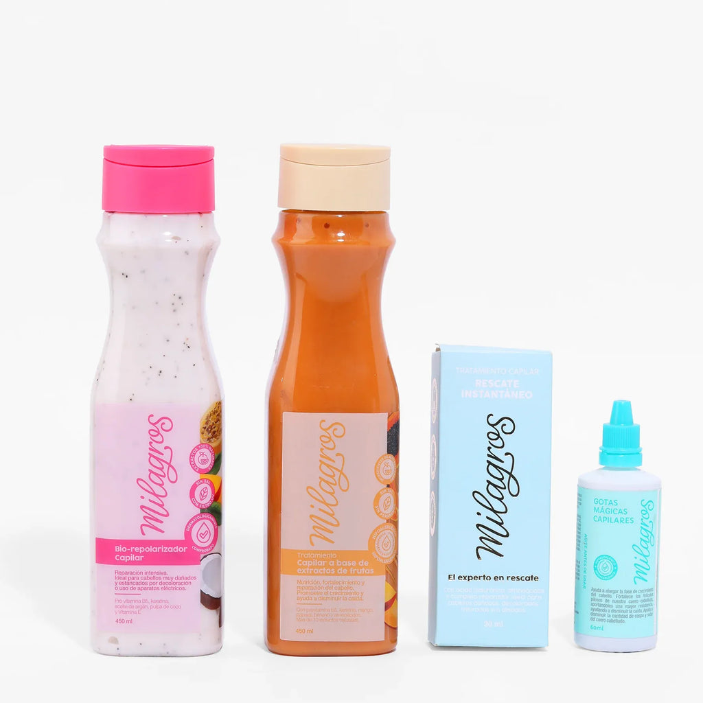 Desarrollado con fórmulas profesionales, el Kit Reparación y Crecimiento de Milagros es un tratamiento intensivo que ataca el problema desde la raíz. Su combinación de Provitamina B5, aceites, extractos frutales y activos revitalizantes es la sinergia perfecta para devolverle la vida a tu cabello.